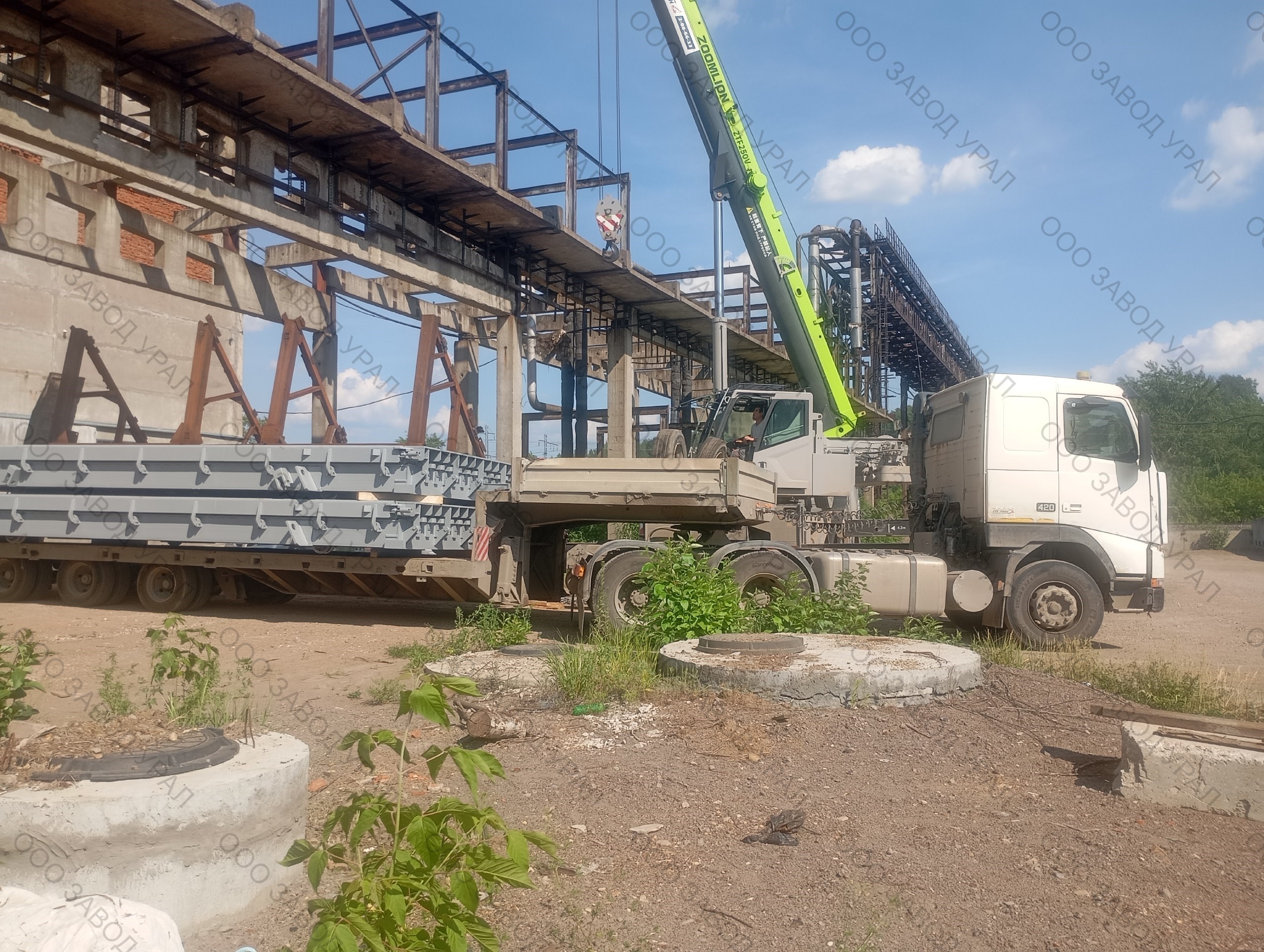 Металлоформы для производства плит перекрытия изготовлены по проекту заказчика. Ввиду того, что форма спроектирована сразу на два изделия, её ширина превысила допустимые габариты по выгрузке. Была спроектирована рама для вывоза формы под наклоном с последующим размещением на трале с помощью крана большой грузоподъемности.